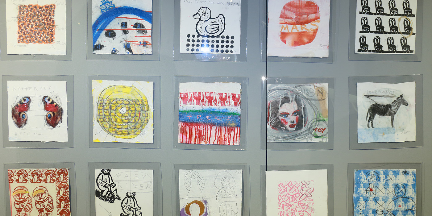 Работы Вадима Бо и Стаса Казимова поразительно разные. На небольших квадратных холстах Стас изображает и обезьяну, которая пришла, а затем ушла, и злое языческое солнце, и чёрно-белых кроликов с зубами, делающих их злыми и очень смешными одновременно. Таких маленьких работ, некоторые из которых, по словам Стаса, вырезаны из больших холстов, девяносто шесть, развешаны они с двух сторон большого стенда. Все они выполнены в смешанной технике: художник совмещает графическую гравюру, литографию и шелкографию. Встречаются знаковые образы массовой культуры: от штурмовиков до сюрреалистичной работы Рене Магритта «Это не трубка», правда, в случае Казимова, не является уткой утка. На одном из холстов изображены незатейливые самолеты и написано «Обнял родину за мох и от радости издох».