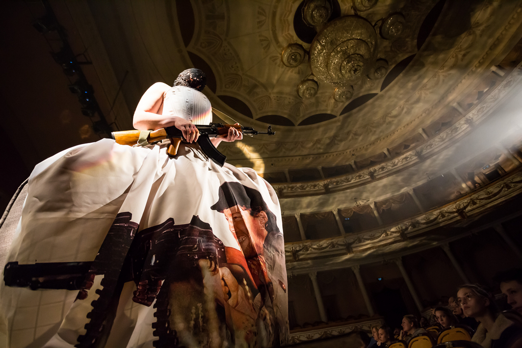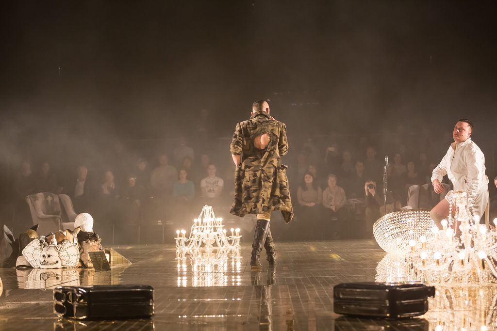 Сцена перемещается в центр зала, а первые ряды, наоборот, в дальний угол сцены. Покупать билеты стоит именно туда: среди кирпичных стен, светомеханизмов, около пульта, особенно сюрреалистичный вид на зрительские ряды и барочные балконы. Такое решение определяет всю динамику спектакля: актеры постоянно перемещаются от одних зрителей к другим, двигаются (видно, что над их пластикой в "Кошке" отдельно и много работали), почти не останавливаются на месте и не смотрят друг другу в глаза. Всю поверхность сцены покрывает золотая плитка, из которой торчат хрустальные светящиеся люстры. Вот в принципе и все декорации, остальное — за актерами, которых в общей сложности около 15 человек. Половина из них — это длинноволосые девушки в платьях, на которых модные принты "Welcome to Sarajevo" и лица цыган, с автоматами в руках, другая половина — бароны в костюмах и их более молодые родственники — в хаки и белом.