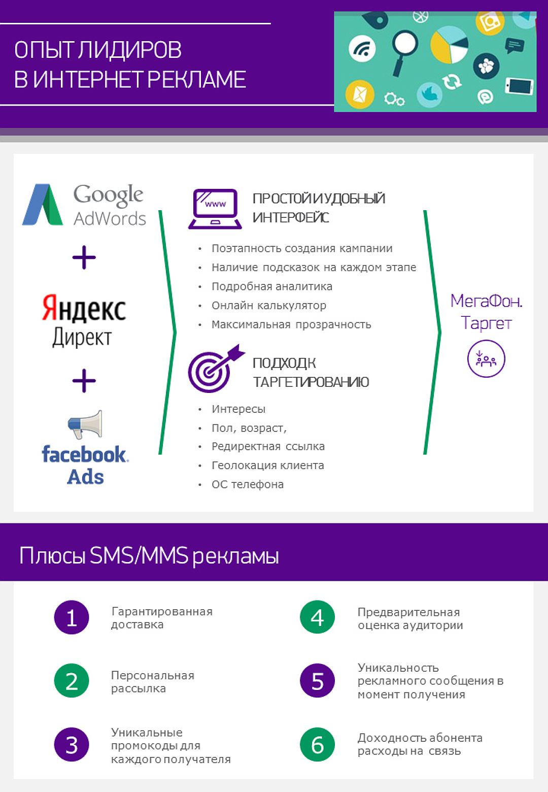 «МегаФон. Таргет» - новая услуга для организации рекламных sms и mms - рассылок для малого и среднего бизнеса. Она не имеет аналогов на рынке. С помощью удобного веб-интерфейса можно настроить и провести рекламную рассылку, а по окончании – точно оценить эффективность.