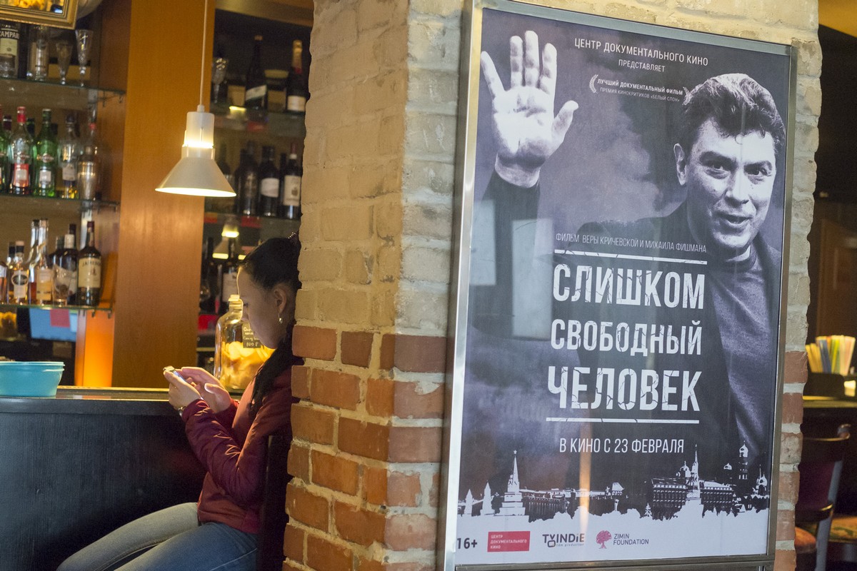 Но до этого показ фильма открылся традиционным для «Зари» спичем Артема Рыжкова, который вспоминает, что Борис Немцов провел маленький кусочек жизни здесь, в «Заре», когда-то. Представив режиссера «Слишком свободного человека» и сообщив о возможных дополнительных показах в зависимости от запросов зрителей, Артем покидает сцену, а Михаил Фишман коротко благодарит собравшихся и отмечает, что лучше будет поговорить после просмотра, а не до. Зал практически полон: несколько свободных мест скорее всего принадлежат людям, купившим билеты, но по каким-то причинам не сумевших добраться до кинотеатра (лично знаю несколько таких). Собравшаяся аудитория, возможно, наиболее эклектична из всех собиравшихся за последнее время в «Заре»: здесь бывший губернатор Егоров, несколько оппозиционных деятелей, атаман Балтийского Союза казаков, представители еврейской диаспоры, юные хипстеры и пожилые поклонники покойного Немцова.