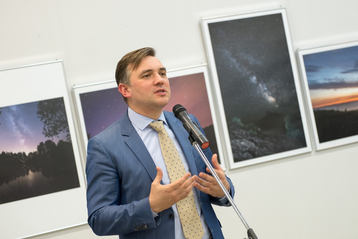 За спиной врио министра по культуре и туризму – та самая серия работ, удостоившаяся специальной премии. Она и впрямь завораживает: эти звёзды, оттенки заката, море и торжество природы затягивают тебя внутрь картинки. Здорово осознать, что ты можешь по-настоящему оказаться в ней – ведь всё это пейзажи наших мест.