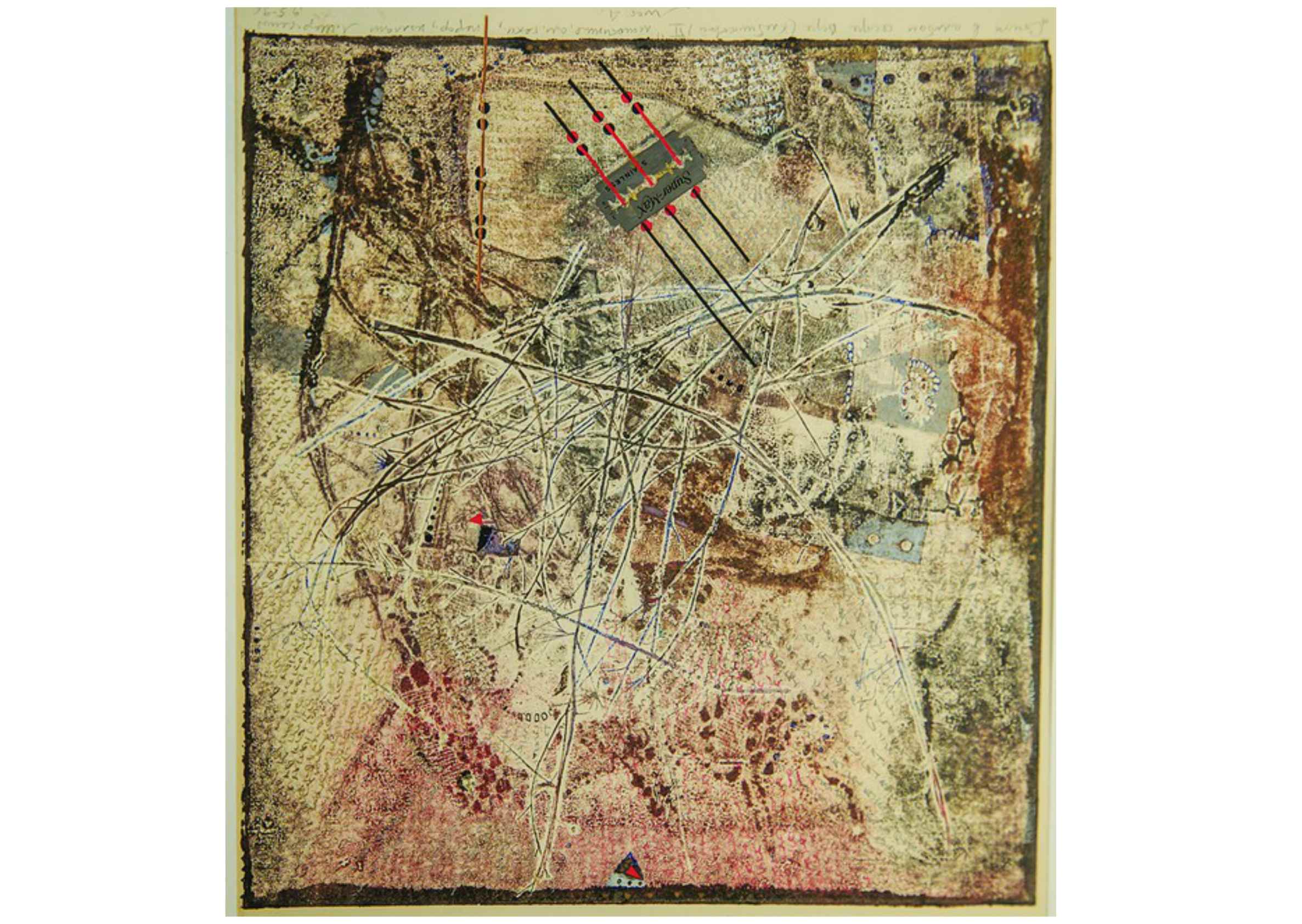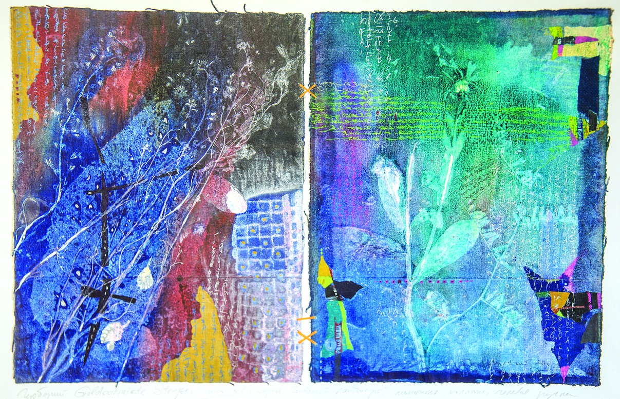 Вглядываясь, замечаешь характерные авторские приемы: на одной из работ встречается лезвие, на другой фрагменты газетных и книжных страниц, которые Шерстяной нередко печатал в экслибрисы.