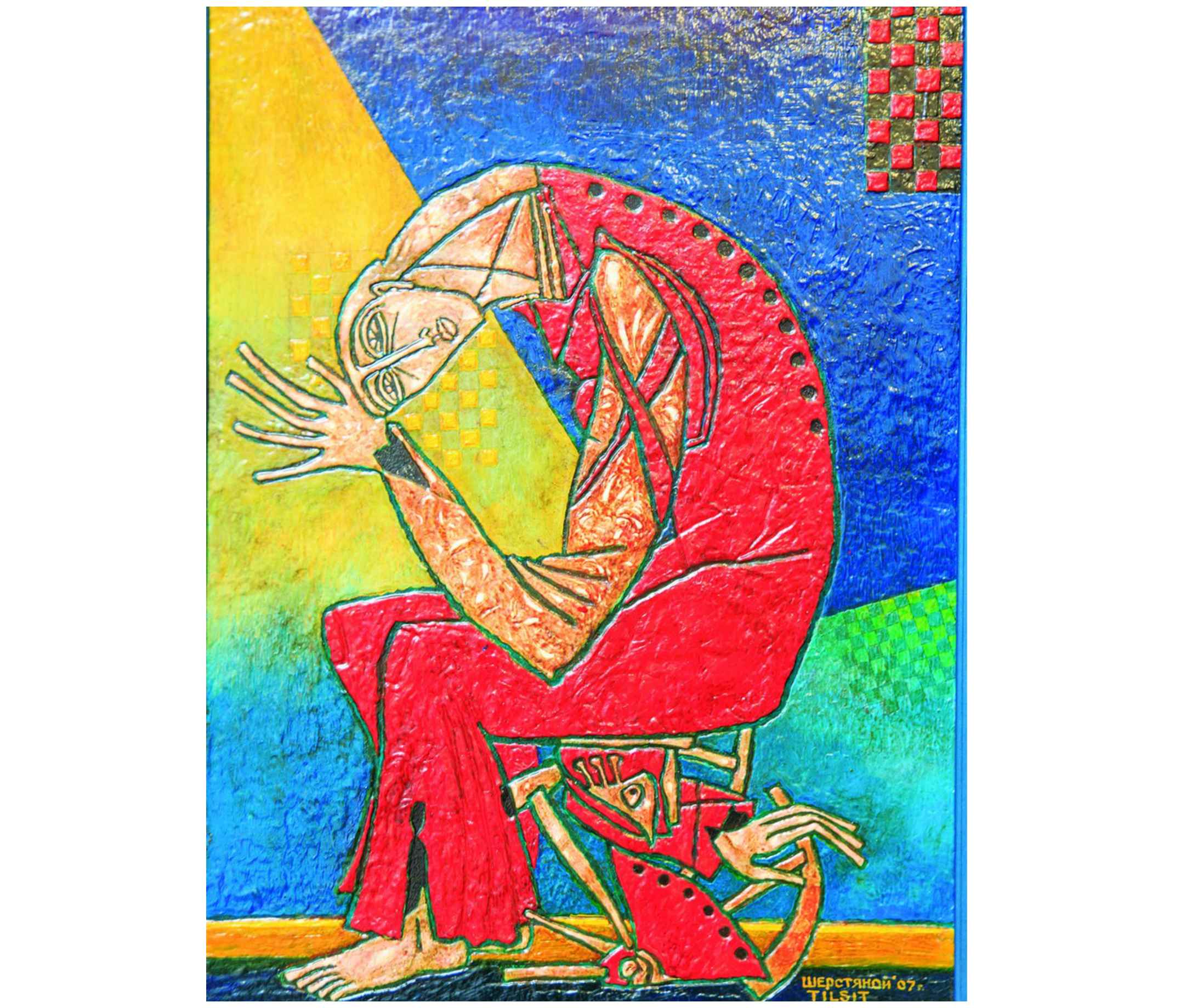На стенах висят репродукции Модильяни, работы Шерстяного из цикла «Ангелы и люди» и цветное исполнение рисунков тушью из последнего цикла «Прусская элегия». Живопись художника словно дышит светом: синий переливается, будто был покрыт глазурью, а бархатистый лимонный создает впечатление, что перед нами витраж. При разглядывании серии вспоминаются мотивы «Искушения» Пикассо — схожая пластика, цирковые сюжеты. При этом центральным образом на картинах Шерстяного остаются женщины: Мадонны с детьми на руках, художницы и фольклорные героини.