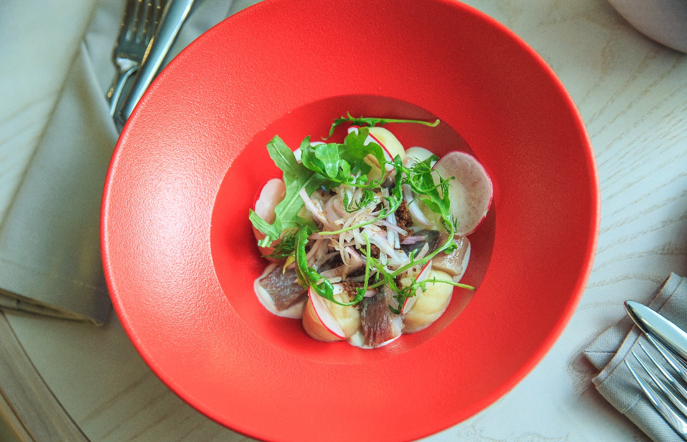 В разделе супов мы получили рекомендацию о крем-супе из зеленого горошка — говорят, хит, но вечером хотелось других экспериментов. Из раздела пасты выбираем равиоли с фермерской рикоттой и шпинатом. Официант приносит пять черных бутонов под плотной шапкой из соуса в красной глубокой тарелке — нежные и сбалансированные. Слегка эпатажно — вот я, например, люблю видеть, что ем. Но что в этом случае, что в случае с янтарной сельдью, в тарелке, похожей на миску, ничего не разобрать из-за плотной шапки из соуса и зелени.