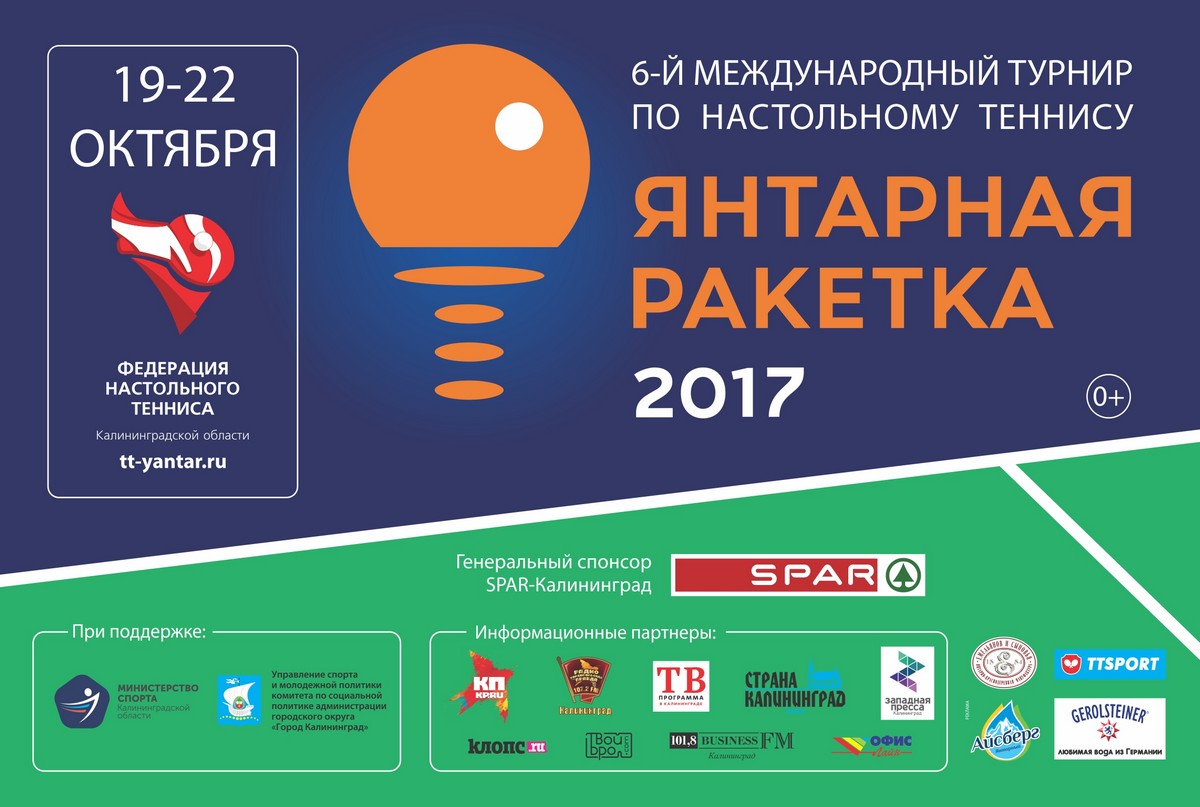 Международный турнир по настольному теннису «Янтарная ракетка 2017» организован Калининградской областной федерацией настольного тенниса и компанией SPAR Калининград. Информационные партнеры: медиагруппа Западная пресса, новостной портал klops.ru, радиостанции: Бизнес-ФМ, радио КП; интернет сайт kp.ru, газеты ТВ-Программа в Калининграде, Комсомольская правда, Страна Калининград, журнал Балтийский Бродвей, сайт tvoybro.com.