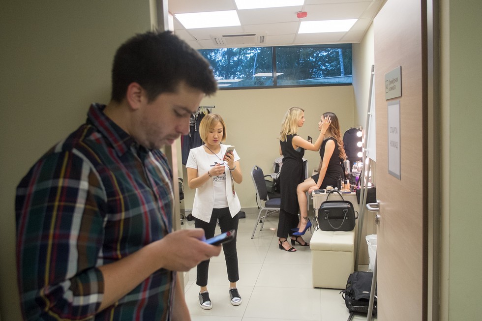 Однако жюри зайдет не отсюда, а со двора «Янтарь холла», поэтому фотографов, операторов и журналистов собирают и проводят через гримерки к другому входу театра эстрады. Пробежка эта стремительная, но кое-какие впечатления зацепить получается. В гримерках царит гогот и волнение, навстречу попадаются люди в карнавальных костюмах и париках, мимо проходит мужик с длинными волосами и электрогитарой через плечо, за приоткрытой дверью группа юношей репетирует синхронный танец и распевает на манер поп-исполнителя Алексеева, выступавшего пару месяцев назад тут же, в «Янтарь холле»: «Если мы вдруг «КиВиН» возьмем, мне это нравится-нравится».