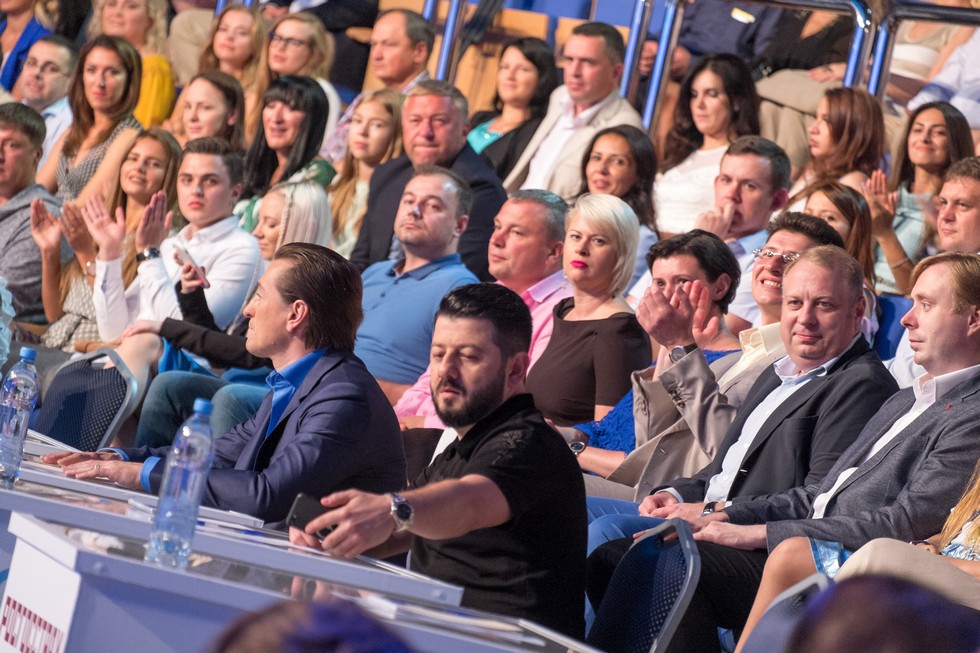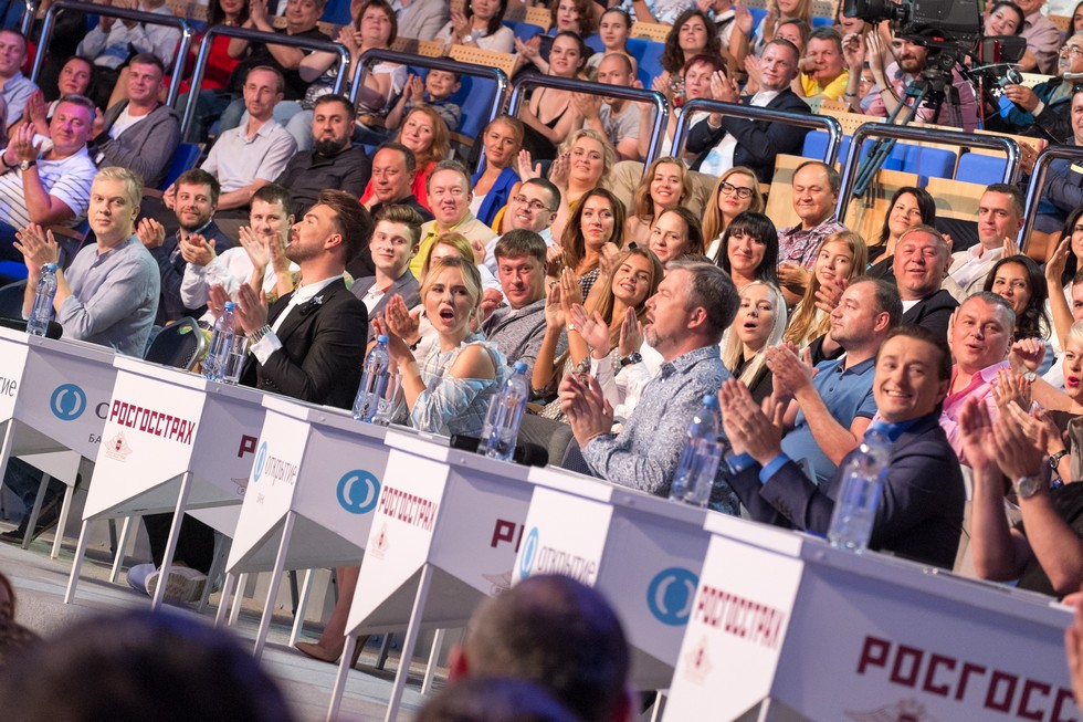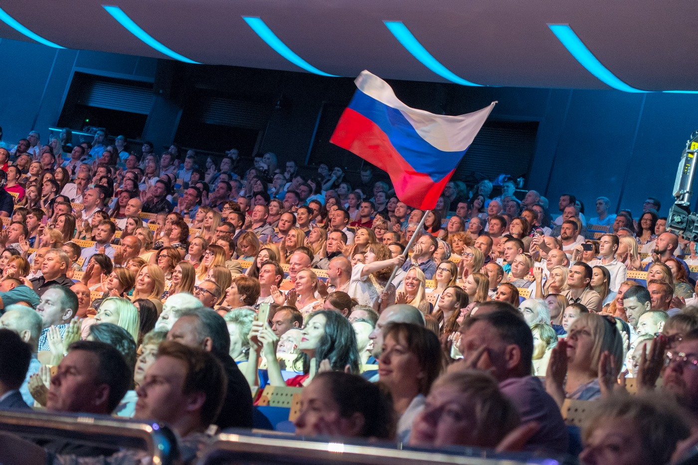 В зале тем временем все в сборе, заняты все без исключения места и приставные стулья. Знакомые лица в партере и амфитеатре отсутствуют. Кажется, что большую часть «Янтарь холла» занимают люди, приехавшие в Светлогорск из «большой России», что неудивительно: розничная цена билетов на «Голосящий КиВиН» достигала 30 000 рублей. Под аплодисменты занимают свои места члены жюри, на экране возникает ролик Светлогорска и «Янтарь холла», и, наконец, бодрым шагом на сцену выходит главный человек в «Клубе веселых и находчивых» – Александр Васильевич Масляков. В своем обращении к зрителям президент Международного союза КВН объявляет о слиянии двух стихий: моря и свежего ветра КВН. В это время бдительные охранники выискивают в зале тех, кто пытается снимать происходящее на телефоны и светят в их объективы лазерными указками.