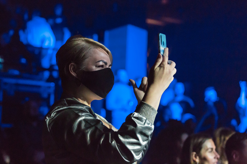 На экране за группой показывают видео, в том числе записи с фестивалей депешей. Ловлю себя на мысли, что уже непривычно видеть такие массовые мероприятия и толпы людей без масок, не соблюдающих дистанцию. Тем ярче контраст с происходящим в клубе: все остаются на расстоянии, а никакого слэма даже представить нельзя.