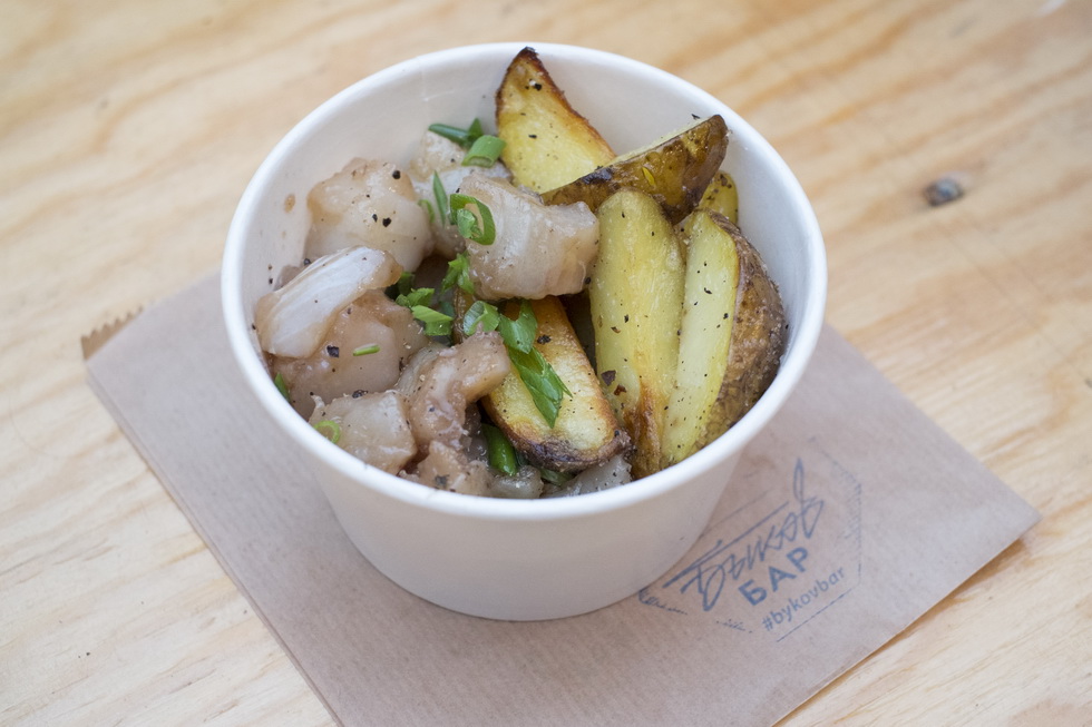 Северная треска круче калининградской, потому что она более экологичная и не похожа на рыхлое папье-маше: примерно так нам объяснили её преимущества ребята в киоске с именем мурманчанина Александра Быкова, которые в обычное время обитают в ТРЦ «Европа». Нарезанная ломтиками сырая треска подаётся с бальзамиком, обжаренными ломтиками картошки и зеленью. На вкус и правда не похожа на калининградскую треску, к тому же довольно сытно.