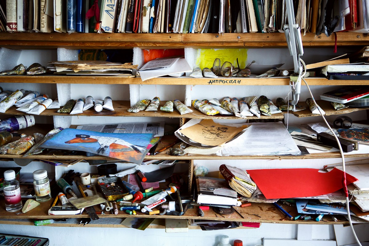 Тем не менее «фон», как и сама мастерская, безукоризненно организованы — каждая деталь занимает свое место, органично дополняя другую. На стенах висят портреты, нарисованные карандашом, небольшие этюды, созданные на берегу моря, и абстрактные работы «постсоветского», как называет его Владимир, периода. Напротив — деревянные полки, заставленные книгами, увесистыми папками с графикой и свернутыми холстами. На небольших гвоздиках старые палитры, ведерки с десятками кистей и миллион мелочей — от старого ключа до причудливо изогнутых ножниц.
