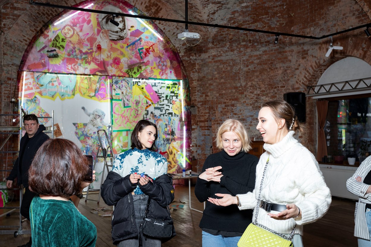 Торжественных открытий из-за пандемии уже почти не проводят, поэтому мы просто пришли в Закхаймские ворота к назначенному времени, чтобы стать одними из первых посетителей выставки «Продукты 24». К этому моменту там уже собралось с десяток гостей, а также сами художницы, ещё работающие над некоторыми экспонатами. Из-за этого ощущения вернисажа не было совсем — казалось, что мы оказались в мастерской. Отчасти так оно и было: крупные коллажи художницы собирали прямо в здании.
