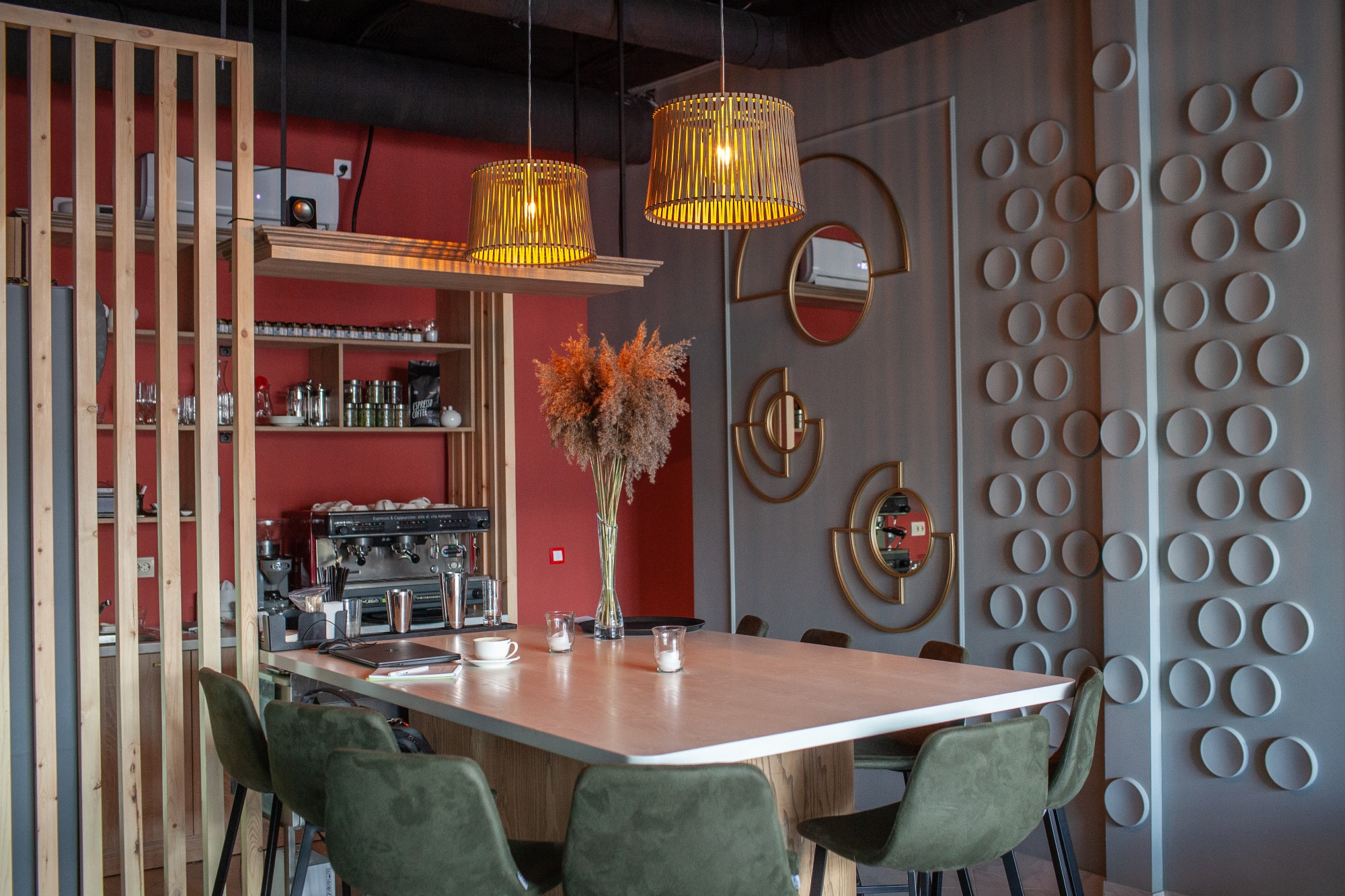 Отдельно стоит отметить интерьер кафе-бара. Помещение визуально разделено на две части: светлая зона с декоративными арками и эстетичными рисунками располагает к непринуждённому завтраку, а тёмная насыщенных тонов хорошо подходит для вечерних мероприятий. По выходным здесь проходят уютные вечера с живой музыкой и вокалом, а за chef’s table* в центре зала часто проводят настольные игры. Каждая деталь, вплоть до уборной, продумана так, чтобы гости чувствовали себя максимально комфортно.