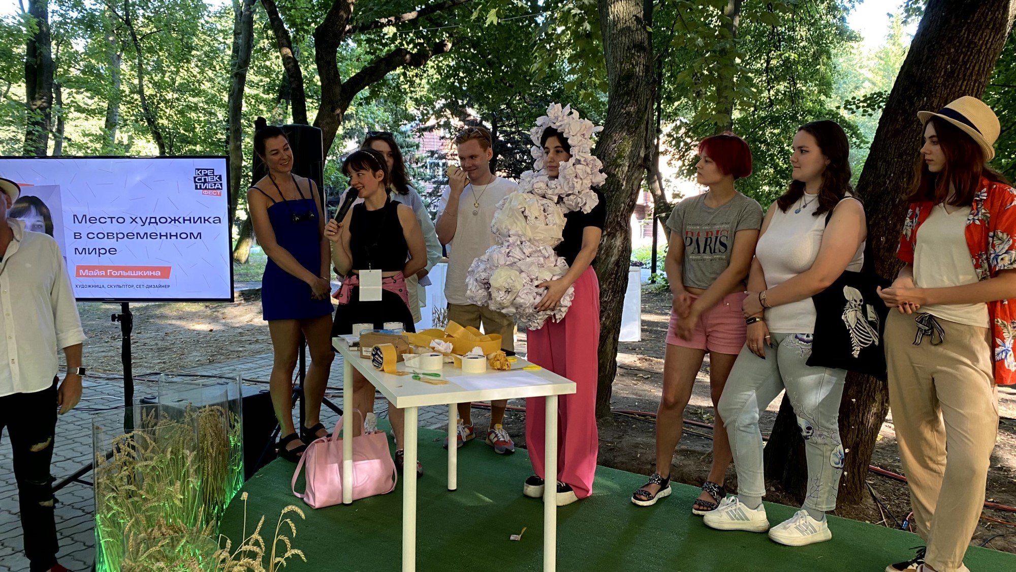 Каждую субботу августа в Центральном парке проходят лекции фестиваля «Креспектива Фест»». В прошлую субботу темами встречи стали искусство и дизайн. И, конечно, многие ждали Майю Голышкину, известную своими смелыми фото-инсталляциями в соцсетях с самодельными костюмами и декорациями. Для их создания она использует подручные предметы: макароны, картон, пену для бритья и многое другое.
