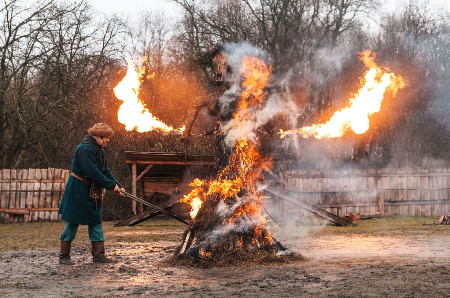 Главное событие, ради которого приехали гости — сжигание чучела Масленицы. Чтобы наконец прогнать зиму, ансамбль «Талица» вместе со всеми желающими отправились на поле, запевая народные песни. Ряженые несли колесо солнца в руках, а сжигание сопровождалось радостными криками и свистами. Но зима, кажется, не собиралась прощаться и сразу после традиционного обряда засыпала поле снегом.