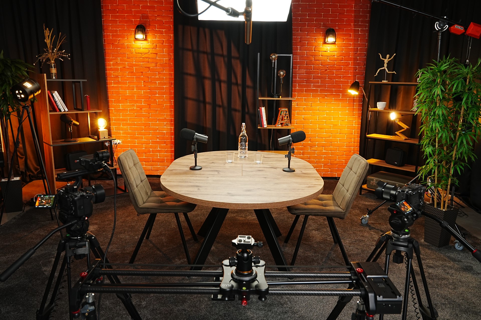 Как правило, мы просим клиента показать, какие подкасты ему нравятся и что он считает красивым. Под это мы выстраиваем сцену, выставляем свет и декорации. Портьеры можем поменять с чёрных на серые, белые стены — на кирпичные, выставить фотофон, мебель и различные элементы декора — вариантов множество.